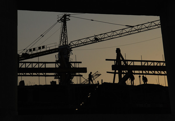 夕阳余晖中,高高的铁架下,建筑工人忙碌的身影彰显得更加坚实有力,定格出新时代奋斗者的画卷。(杨兰摄)